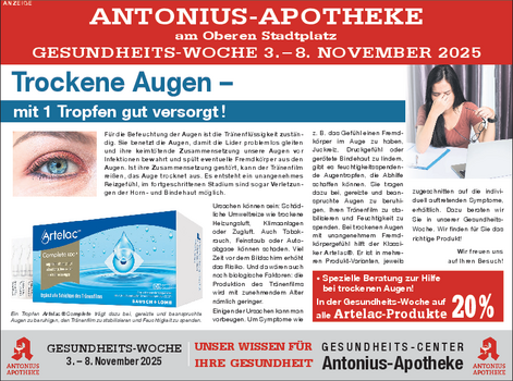 Ursachen können sein: Schädliche Umweltreize wie trockene Heizungsluft, Klimaanlagen oder Zugluft. Auch Tabakrauch, Feinstaub oder Autoabgase können schaden. Viel Zeit vor dem Bildschirm erhöht das Risiko. Und da wären auch noch biologische Faktoren: die Produktion des Tränenfilms wird mit zunehmendem Alter nämlich geringer. Einigen der Ursachen kann man vorbeugen. Um Symptome wie z. B. das Gefühl einen Fremdkörper im Auge zu haben, Juckreiz, Druckgefühl oder gerötete Bindehaut zu lindern, gibt es feuchtigkeitsspendende Augentropfen, die Abhilfe schaffen können. Sie tragen dazu bei, gereizte und beanspruchte Augen zu beruhigen, Ihren Tränenfilm zu stabilisieren und Feuchtigkeit zu spenden. Bei trockenen Augen mit unangenehmem Fremdkörpergefühl hilft der Klassiker Artelac®. Er ist in mehreren Produkt-Varianten, jeweils zugeschnitten auf die individuell auftretenden Symptome, erhältlich. Dazu beraten wir Sie in unserer Gesundheits-Woche. Wir finden für Sie das richtige Produkt!